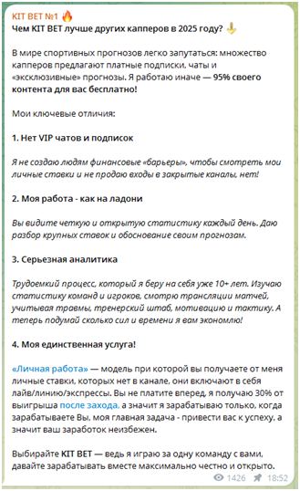 Опытные каперы являются надежными партнерами для беттеров. Благодаря помощи таких профессионалов новички могут легко начать зарабатывать, просто используя спортивные сигналы. Проблема состоит в том, что определенные аналитики берут на себя ответственность выдавать прогнозы, не имея для этого достаточных навыков. Администратор Телеграмм-канала KIT BET №1 🔥 убеждает подписчиков в своей исключительной эффективности. Стоит ли с ним сотрудничать — покажет обзор.
