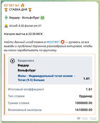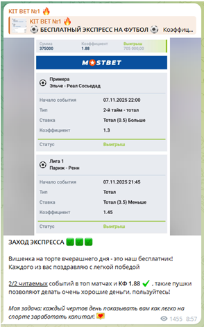 Капер не стесняется предлагать подписчикам партнерскую букмекерскую контору. Админ утверждает, что БК МостБет никогда не обманывает, выставляет хорошие кэфы на события и отличается строкой финансовой дисциплиной. Он сразу предлагает промокод, по которому можно получить крупных приветственный бонус. Конечно же ведущий Телеграмм-канала KIT BET №1 🔥 зарабатывает на реферальных выплатах в указанном заведении. За каждого приведенного клиента ему причитается премия. Вся выдача сигналов здесь является лишь маскировкой и способом привлечения внимания.