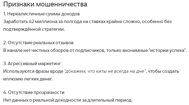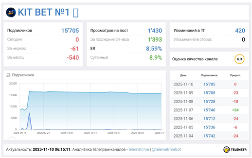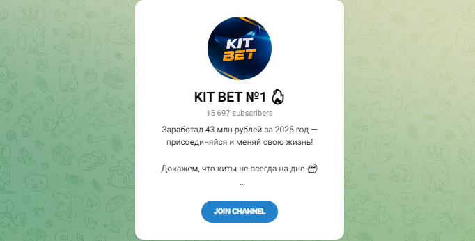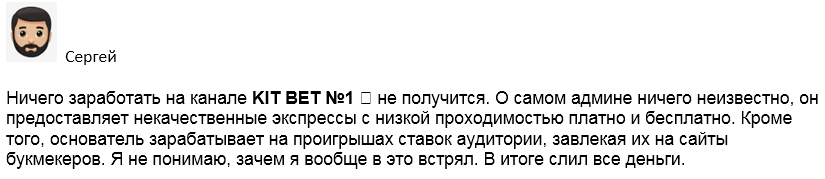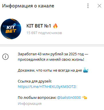 Сотрудничество с Телеграмм-каналом KIT BET №1 🔥 не рекомендуется. Капер не может убедительно доказать свою эффективность, а значит применения его советов лучше избежать. Отсутствие содержательной аналитики порождает подозрения о том, что админ выдает сигналы с других ресурсов за свои и перепродает их.