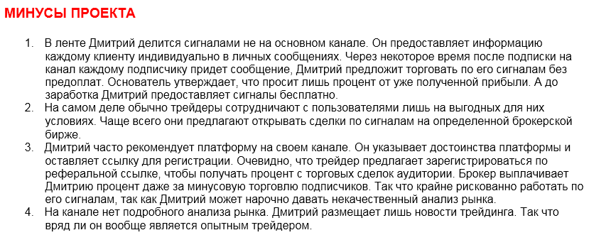 Все попытки найти реальные доказательства того, что Дмитрий является эффективным трейдером не находят подтверждения. Публикация множества новостей в ленте вообще ничего не значит. Это всего лишь перепечатка статей из профильных информационных ресурсов. Ведущий пытается выглядеть опытным аналитиком благодаря своим пространным рассуждениям про положение дел на бирже.