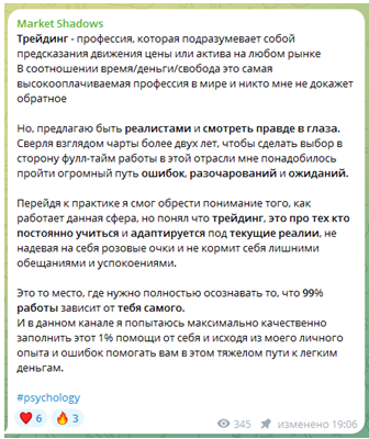 Экономические блогеры относятся к отдельной категории коммерсантов. Как правило, это успешные трейдеры или спекулянты, которые достигли определенного уровня в бизнесе и сейчас готовы делиться своими знаниями на платной основе. Телеграмм-канал Market Shadows выделяется своей готовностью работать бесплатно. Стоит ли доверять такому щедрому жесту, покажет онлайн-аудит.
