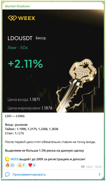 Чтобы клиентам было проще проводить операции, админ подобрал для них торговые площадки. Партнерской биржей является BingX, назначать операции с криптой по мнению ведущего лучше на Weex.