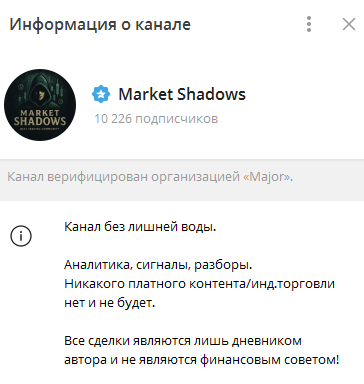 Выложенная в Телеграмм-канале Market Shadows коммерческая информация вместо прибыли принесет только убыток. Админ не является профессиональным аналитиком. Он создает себе ауру успешного спекулянта и заманивает подписчиков на партнерские сайты ради реферальных выплат.