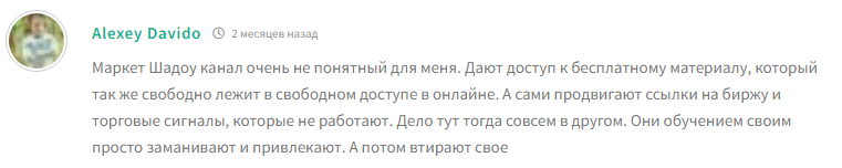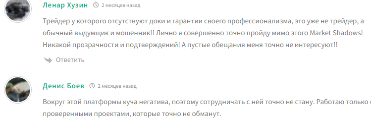 Опытные спекулянты в своих отзывах не рекомендуют связываться с Телеграмм-каналом Market Shadows. По их мнению, админ является обычным мошенником, который выдает себя за профессионального аналитика и этим пытается заполучить доверие подписчиков.