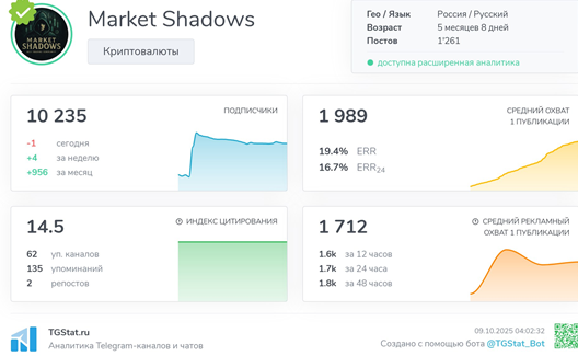 На день проведения обзора Телеграмм-канал Market Shadows обладает клиентской базой в 10 226 подписчиков. Учитывая, что площадка действует чуть больше 5 месяцев, показатель выглядит неплохо. Вот только детальное изучение статистики меняет всю картину.