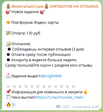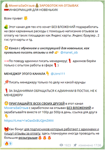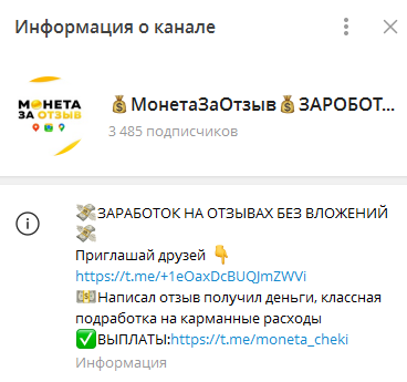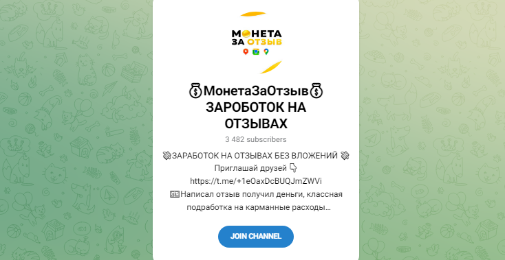 Продвижение товаров и услуг на рынке происходит с привлечением различных методов влияния на аудиторию. Прямая реклама при одиночном применении не всегда достигает нужного эффекта, результат будет выше при подкреплении ее отзывами пользователей. Администратор Телеграмм-канала 💰МонетаЗаОтзыв💰ЗАРОБОТОК НА ОТЗЫВАХ предлагает своим подписчикам заняться именно такой подработкой. Реально ли здесь выйти на стабильный доход — покажет онлайн-проверка.