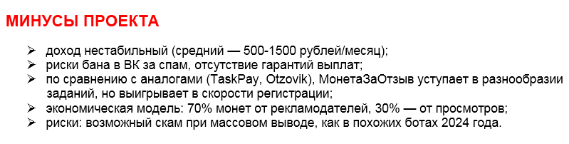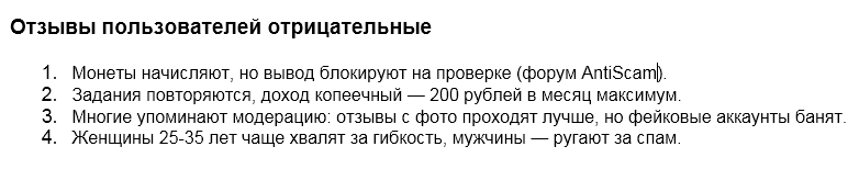 Обнаруженные в открытых источниках отзывы раскрывают, как здесь организован скам. Админ предлагает условия сотрудничества, похожие на настоящие. Однако после выполнения некоего заказа расчет не настает. Ведущий убеждает, что нужно немного подождать, но в реальности клиент остается без своего авансового платежа.