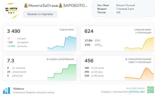 На день проведения обзора Телеграмм-канал 💰МонетаЗаОтзыв💰ЗАРОБОТОК НА ОТЗЫВАХ обладал клиентской базой в 3 488 клиентов. При этом стаж работы ресурса не очень большой, площадка функционирует немногим более 7 месяцев.