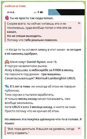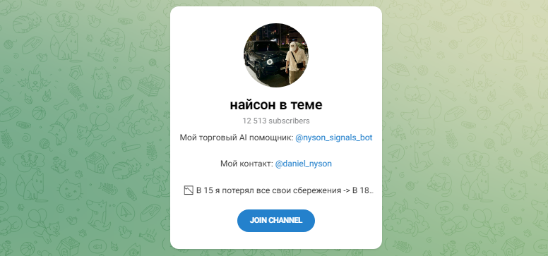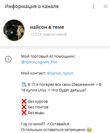 Ведущий канала представляется именем Даниэль Найсон. Скорее всего это псевдоним, но для клиентов данная информация не имеет принципиального значения. В закрепленном сообщении админ рассказывает, что очень рано зашел в трейдерский бизнес и его старт не был успешным. В 15 лет он потерял все свои сбережения из-за неудачных сделок. Но благодаря целенаправленной работе над собой в 18 ему уже удалось купить очень дорогую машину.
