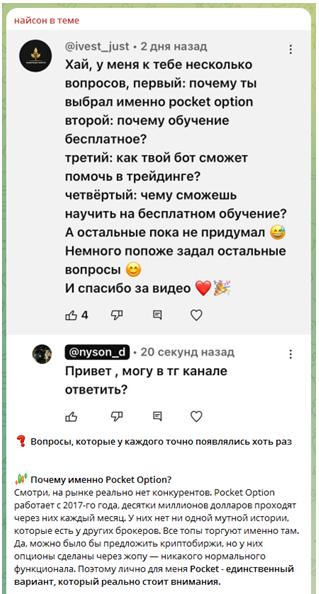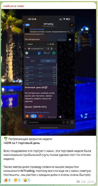 Изучение канала показывает, что админ имитирует заработок на бинарных опционах. Все его публикации направлены на формирование ложного образа просторы получения дохода в этой сфере. Партнерская биржей является конечно-же PocketOption. Эта площадка известна тем, что активно привлекает блогеров для завлечения новый клиентов по реферальной программе. Бинарные опционы по своей сути ближе к ставкам в казино, чем к расчетливым сделкам. Профессиональные трейдеры игнорируют этот способ заработка.