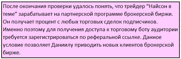 Администратор Телеграмм-канала Найсон в теме пытается выглядеть профессионалом, но на деле лишь заманивает клиентов на партнерскую биржу. Предлагаемый им способ заработка крайне рискован и почти всегда приводит к снижению депозита.