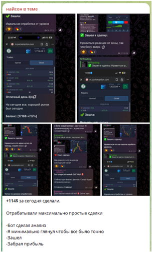 Благодаря успешно разработанным алгоритмам этот робот якобы выдает практические безошибочные прогнозы по заключение ордеров. Услугами этого ПО может воспользоваться любой подписчик Телеграмм-канала найсон в теме.