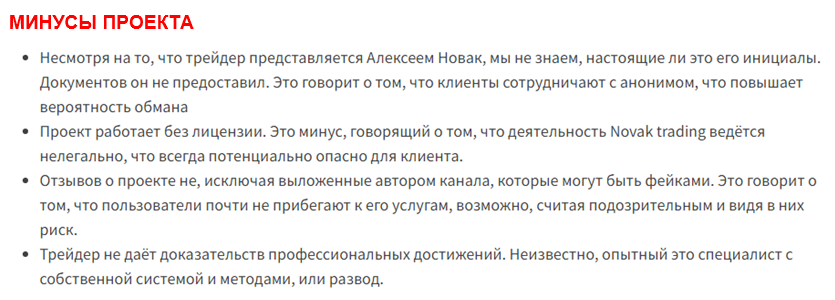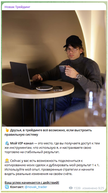 Администратор Телеграмм-канала Новак Трейдинг на самом деле мелкий мошенник, который обещает клиентам выгодную коммерческую информацию. Но реально он даже не получает доступ к деньгам подписчиков, а довольствуется выплатами партнерской биржи. Сотрудничество с ним приведет к уменьшению размера банка.