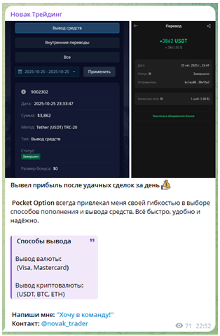 В ходе изучения постов Новака выясняет, что для бизнеса он использует криптобиржу PocketOption. Главным торговым ресурсом здесь выступают бинарные опционы. Данное направление трейдинга крайне рискованно из-за мало подверженности к прогнозированию. Размер выплат в случае успешного контракта никогда не превышает изначально внесенную сумму. А вот если трейдер ошибется — биржа забирает себе весь банк.