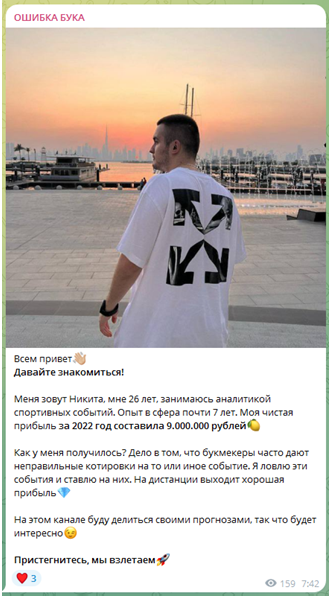 Администратора канала зовут Никита. Более 6 лет он занимается аналитикой спортивных событий, только за 3 года смог заработать 9 миллионов рублей. Никита решил делиться со своими подписчиками прогнозами и дать им возможность получать неплохой доход, обещая им, что с ним будет интересно.