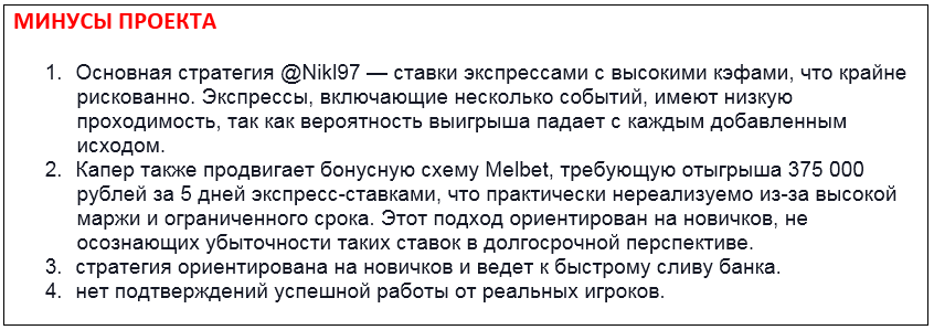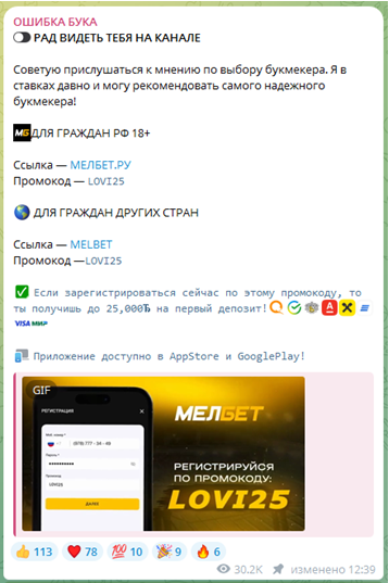 Новостная лента очень часто включает упоминания партнерской букмекерской конторы, где админ делает ставки. Речь идет о довольно известной площадке МелБет. Интенсивность фактического рекламирования указанной БК в канале очень велика. Это говорит о том, что админ занимается получением дохода по реферальной системе. Контора платит ему отчисления за каждого клиента, которого он сюда привел. Такой бизнес не несет для администратора никаких рисков, а вот обычные бетеры могут здесь лишиться депозита.