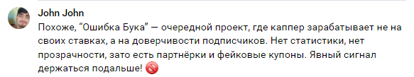 Найденные в сети отзывы о Телеграмм-канале ОШИБКА БУКА заполнены негативом по отношению к данной площадке. Пользователи, которые уже имели опыт назначения ставок с помощью Ника, жалеют о своем выборе. Главной причиной критики выступает низкая проходимость событий. Выйти на стабильный положительный доход тут невозможно.