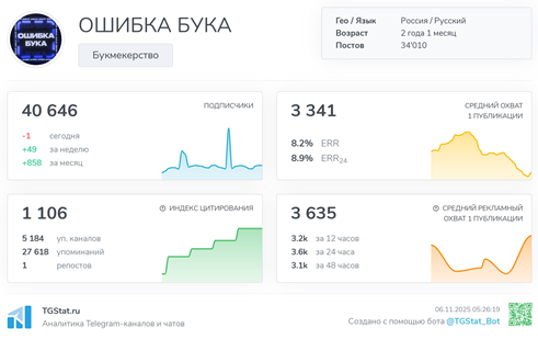 Телеграмм-канал ОШИБКА БУКА на день проверки действовал уже 2 годи и 1 месяц, при этом его клиентская база начитывала 40 633 пользователя. Внешне статистические показатели работы выглядят неплохо, но хорошее впечатление о них сохраняется только до уточнения деталей.