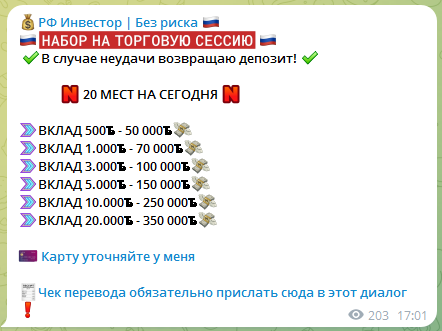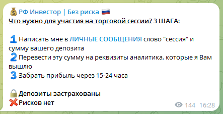 Отзывы клиентов о Телеграмм-канале 💰РФ Инвестор | Без риска 🇷🇺 показывают, как же здесь на самом деле внедрен скам. После установления контакта администратор убеждает подписчика сделать инвестицию. Но вдруг выясняется, что для получения выплаты нужно оплатить страховку, налоги и комиссионные сборы. Причины, чтобы выманить деньги у подписчиков придумываются Ульяной очень быстро. Никаких выплат она не производит.