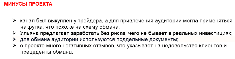 Ульяна является лишь частью команды по организации скама. Со своими партнерами она тщательно выполняет ходы по заманиванию к себе подписчиков. Но все ее клиенты вместо прибыли получат только потерю депозита. Рекомендовать Телеграмм-канал 💰РФ Инвестор | Без риска 🇷🇺 к сотрудничеству мы не можем.