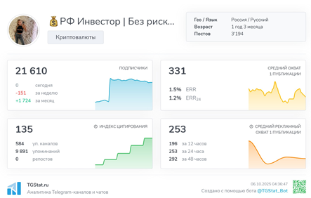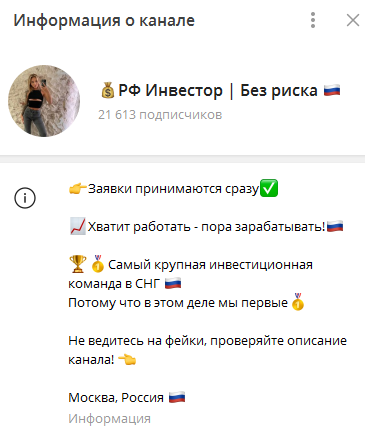 На момент подготовки обзора Телеграмм-канал 💰РФ Инвестор | Без риска 🇷🇺 обладал клиентской базой в 21 613 подписчиков, при этом сам ресурс действовал уже 1 год и 3 месяца. Результат можно было назвать неплохим, но изучение детальной статистики расставляет все на свои места.