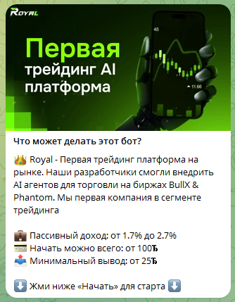 Компания, которая управляет ботом, характеризует себя как первую трейдинг-платформу на рынке. Якобы разработчики фирмы смогли успешно внедрить ИИ-агентов для проведения эффективных спекулятивных сделок. Площадками для операций выступают биржи BullX и Phantom. Автоматизированные боты берут на себя все заботы трейдеров в бизнесе и позволяют получать пассивный доход от 1,7 до 2,7% ежесуточно.
