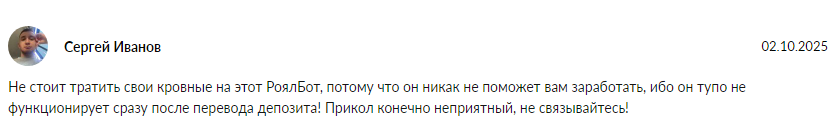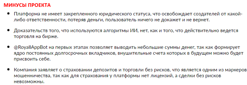 Телеграмм-канал Royal и связанные с ним ресурсы управляются скамерами и предназначены только для воровства средств подписчиков. Вся мошенническая система построена очень убедительно, трейдеры без опыта коммерческой работы вполне могут попасться на эту уловку и остаться без депозита.