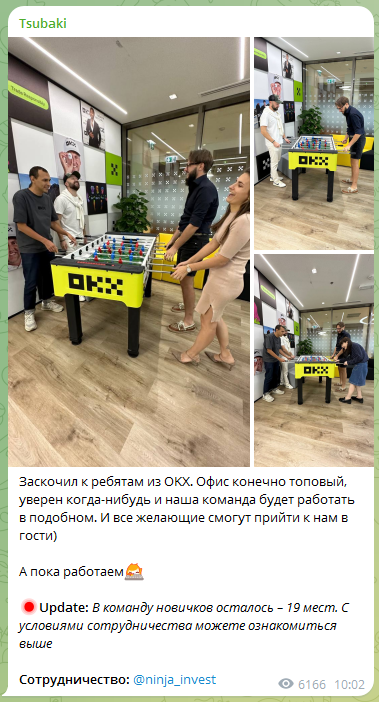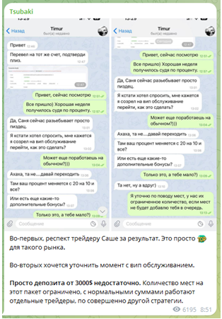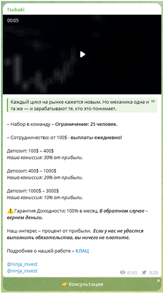 Администратор Телеграмм-канала Tsubaki заманивает подписчиков с помощью старого приема скамеров — обещаниями больших выплат при скромных вкладах. На самом деле он присваивает средства клиентов с целью личного обогащения. Любое сотрудничество с ним запрещено.