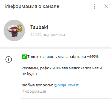 Телеграмм-канал Tsubaki ведет экономический блогер, который утверждает, что отлично умеет зарабатывать деньги. Сейчас админ занимается набором спекулянтов в торговые группы. Стоит ли с ним связываться, покажет аудит.