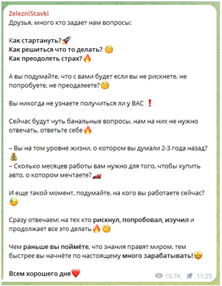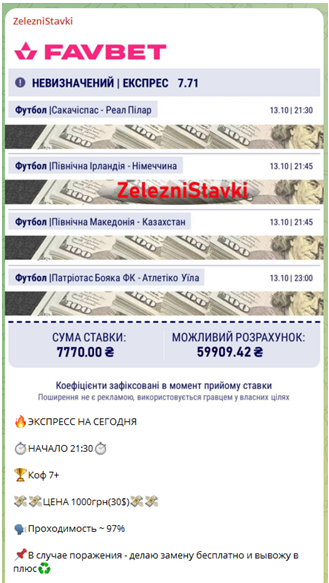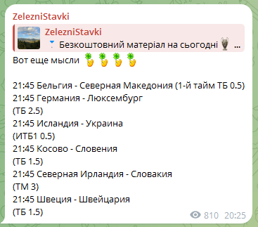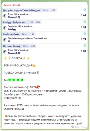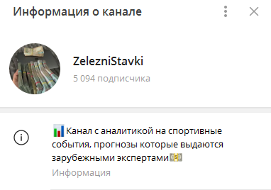 На день проведения обзора Телеграмм-канал ZelezniStavki насчитывал 5 094 клиента. Для спортивного ресурса это является неплохим показателем, но в нашем случае не все так однозначно.