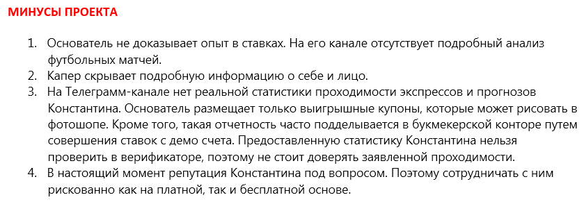 Никаких достоверных доказательств успешности прогнозов от Константина нет. Его рассказы о личной эффективности объективно ничем не подтверждаются. В канале нет сильных аналитических обзоров, капер просто продает ставки как товар и даже не обеспечивает им информационную поддержку.