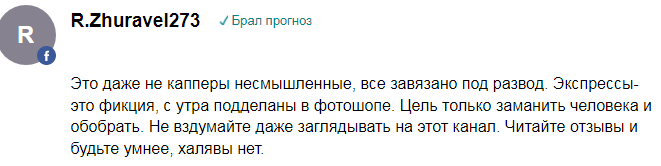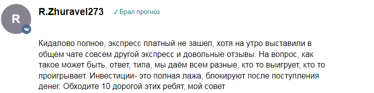 Найденные отзывы характеризуют Телеграмм-канал ZelezniStavki далеко не с лучшей стороны. Бетеры считают, что админ зарабатывает на них, а взамен не выдает желаемых данных. Проходимость прогнозов низка, а значит они не стоят заплаченных за них денег.